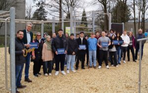 Schlüsselübergabe für den neuen Calisthenics-Parcours auf dem Sportplatz des SGB