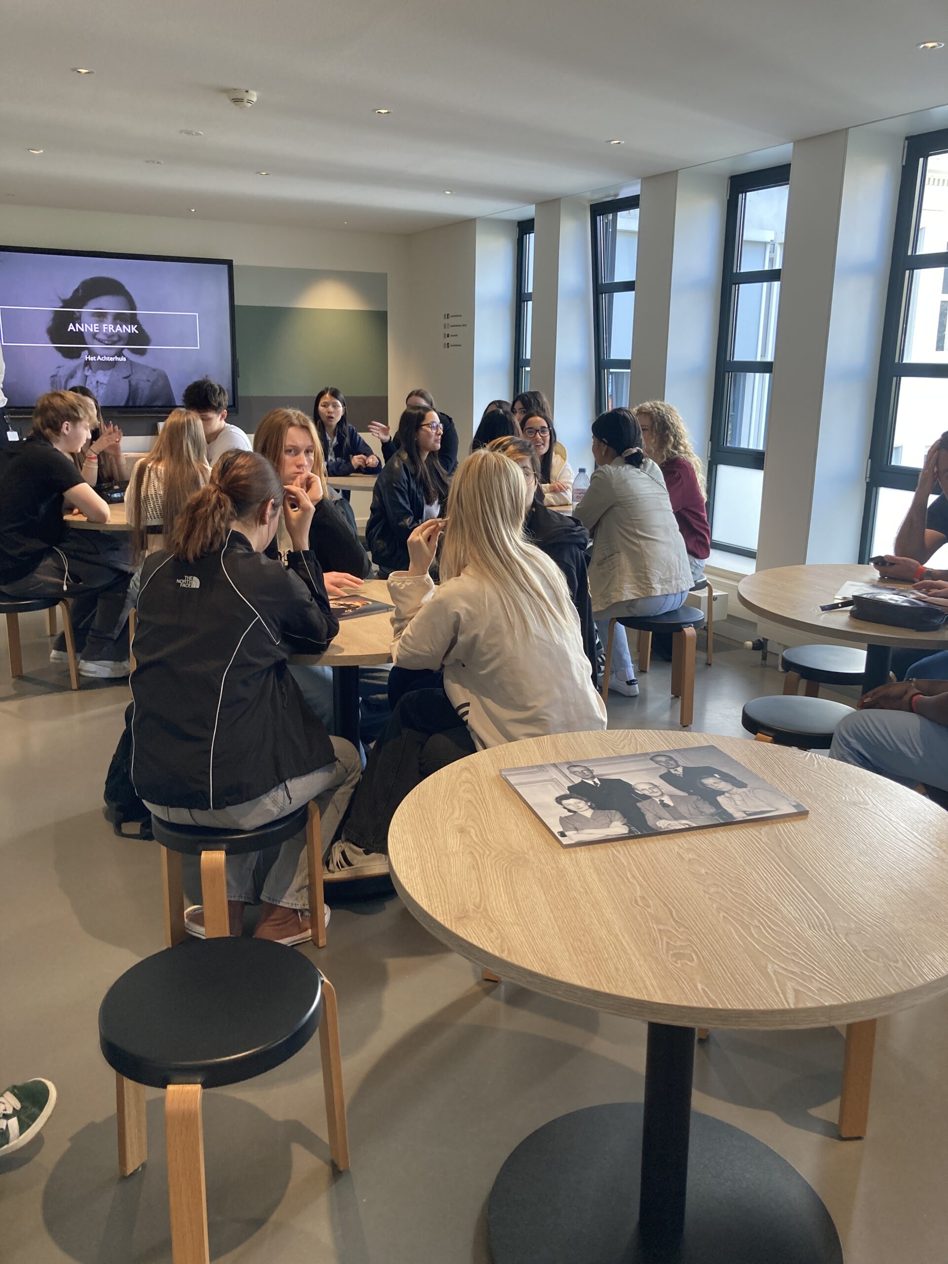 Am Freitagmorgen um 7:15 Uhr traf sich die Gruppe an der Bushaltestelle der Schule, um gemeinsam die Reise in die niederländische Metropole anzutreten. Nach einer etwa vierstündigen Fahrt erreichten die Schülerinnen und Schüler das Meininger Hotel Amstel Amsterdam, wo das Gepäck deponiert wurde. Ohne lange Pause ging es mit den öffentlichen Verkehrsmitteln direkt zum Anne Frank Haus. Dort hatten die Teilnehmer:innen die Gelegenheit, sich intensiv mit der Geschichte von Anne Frank und ihrem berühmten Tagebuch auseinanderzusetzen. Die bedrückende, aber gleichzeitig sehr wichtige Auseinandersetzung mit der NS-Zeit hinterließ bei allen einen nachhaltigen Eindruck.