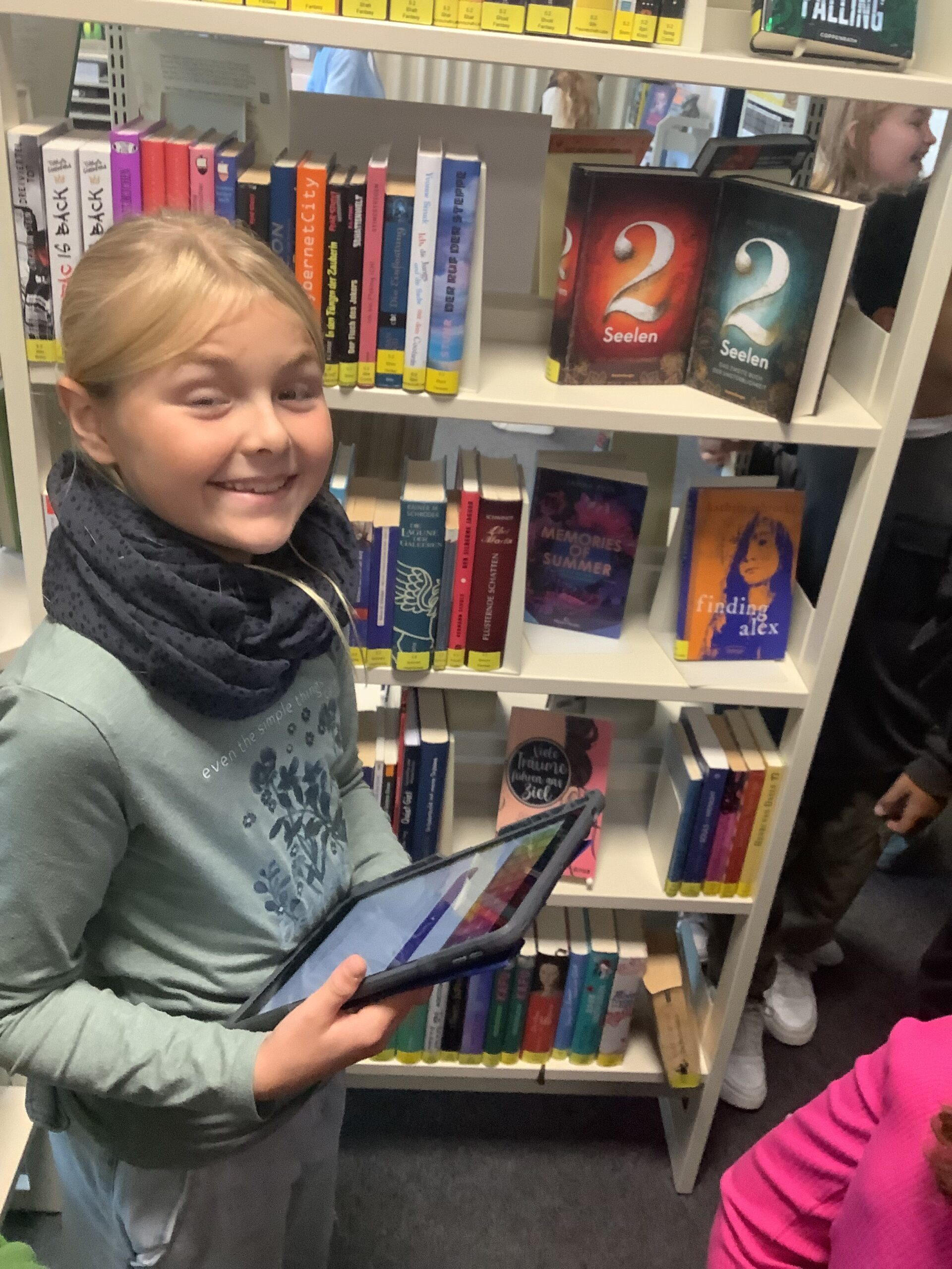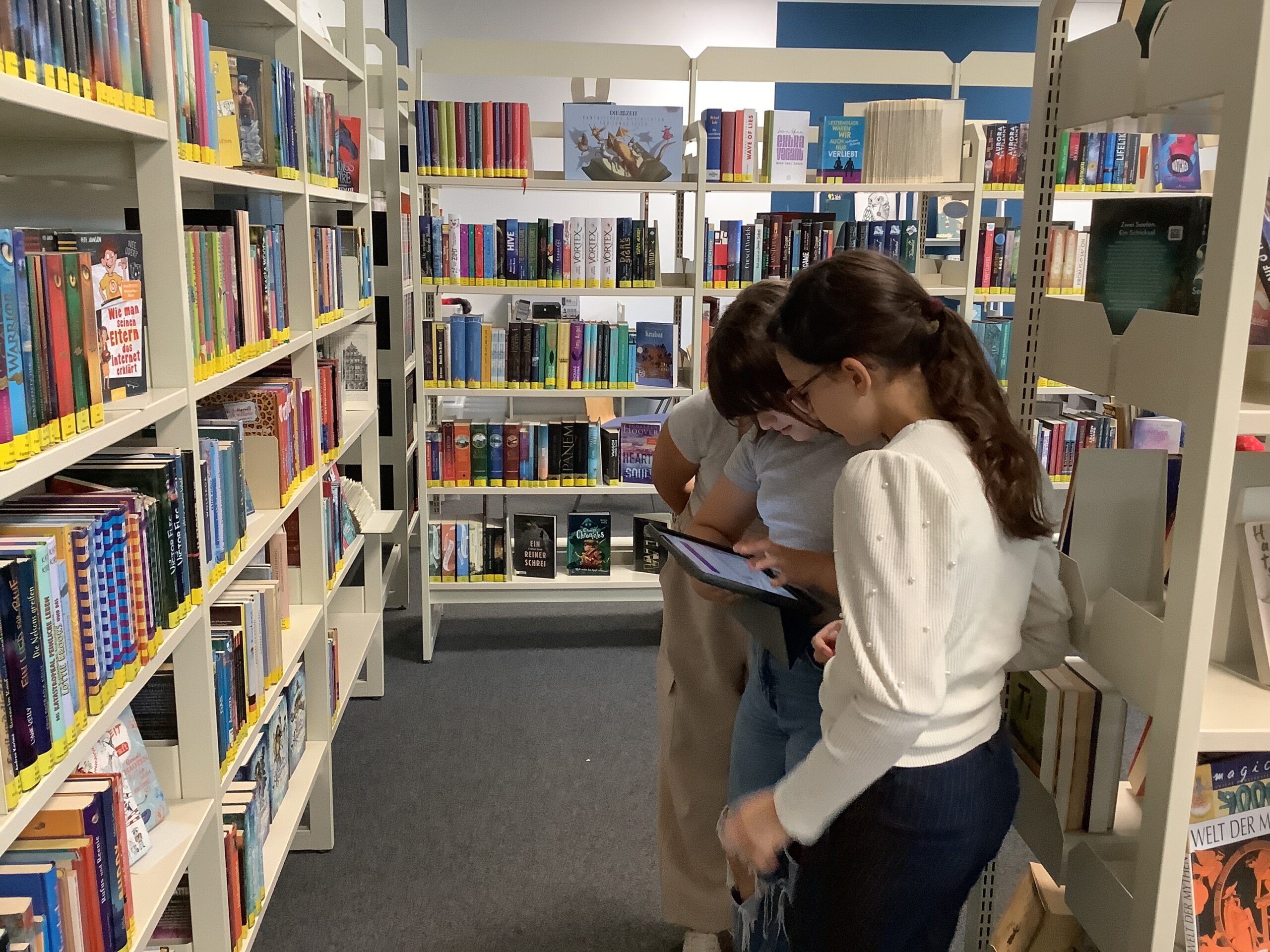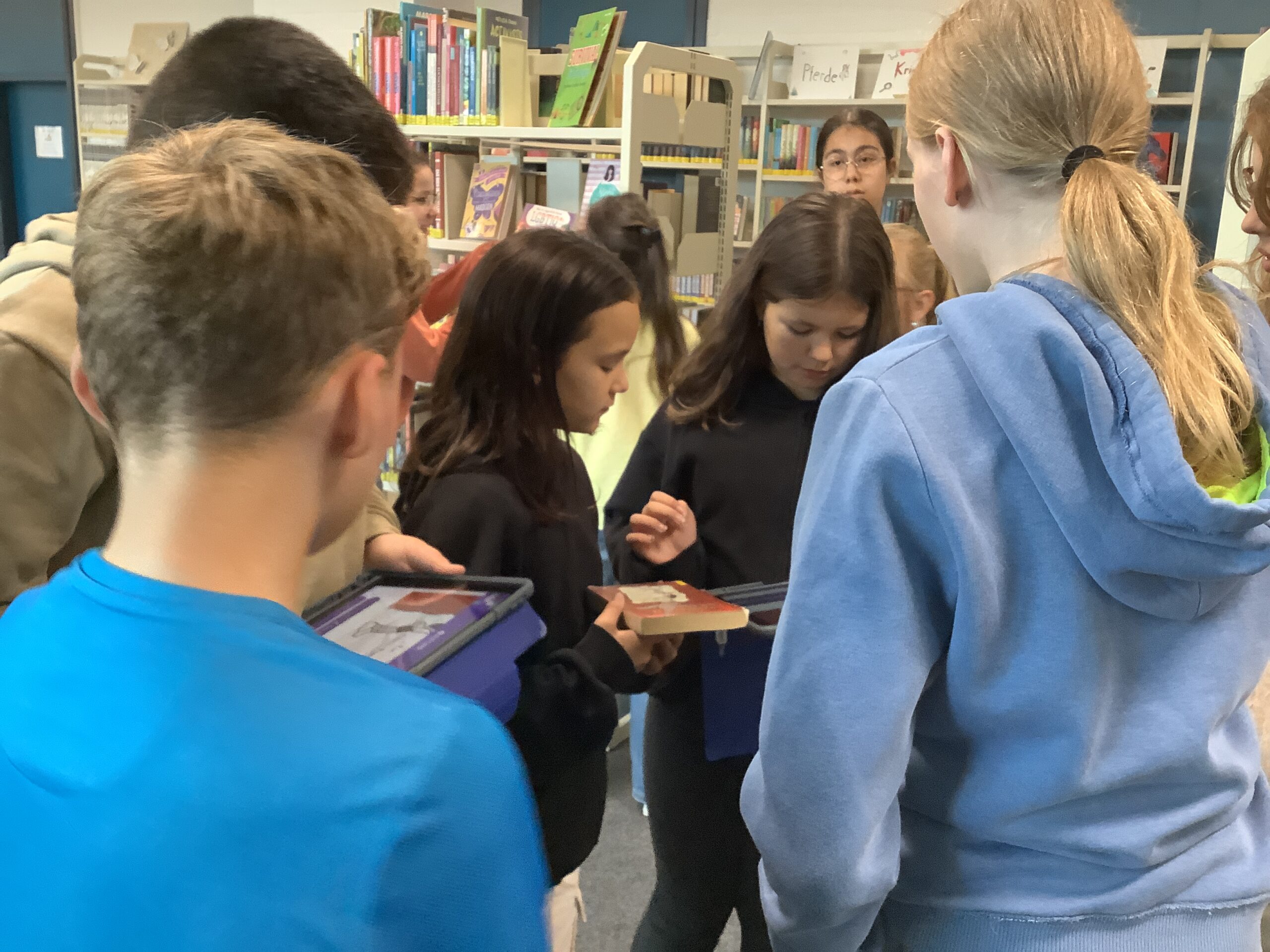 Am Dienstag und Mittwoch, dem 24./25.09. haben die 5c und die 5a den Anfang gemacht und an der Schulbüchereiführung der Lesescouts teilgenommen. Damit die Fünftklässler:innen die Bücherei auf spannende und kreative Weise kennenlernen können, haben die Lesescouts des SGB ein Biparcours-gestütztes Quiz entwickelt, bei dem die Schüler:innen der fünften Klassen Fragen beantworten und Aufgaben lösen müssen: „Wie lautet der Name des Autors der Reihe „Gregs Tagebuch“? Und unter welcher Rubrik findet man die Bücher? Welche Buchreihen mit Satzzeichen im Titel kann man in der Schulbücherei ausleihen? Notiere den Standort und die Signatur! Finde das Buch „Fußball – Auf- und Abwärmen“ und führe die Übung auf S. 37 durch“. Das sind nur einige der Aufgaben rund um den Bestand, die Ausleihe und die Regeln in der Bücherei, die gelöst werden wollen. Am Ende dieser multimedialen Führung erhalten die Schüler:innen ihren eigenen Büchereiausweis, den sie sowohl für die Ausleihe in der Schulbücherei des SGB als auch in der Stadtbibliothek Bergkamen nutzen können. Nun steht dem Schmökern in und dem Ausleihen von Büchern nichts mehr im Wege!
