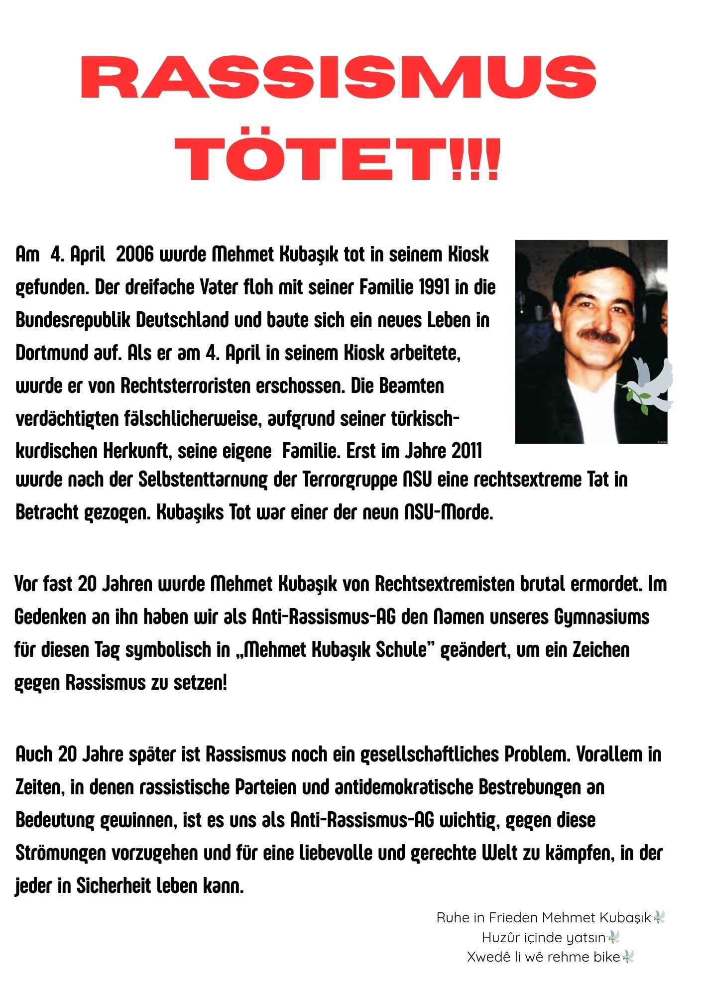 Um an ihn und das Leid seiner Familie zu erinnern, wurde das SGB am letzten Schultag vor den Osterferien symbolisch in „Mehmet-Kubasik-Schule“ umbenannt. Mit dieser Aktion setzt die Schulgemeinschaft ein deutliches Zeichen gegen das Vergessen, gegen Rassismus und für die Menschlich-keit.