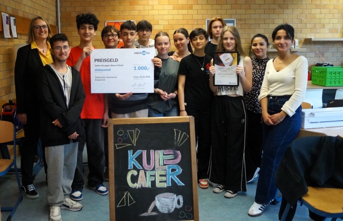Wir freuen uns, bekannt geben zu können, dass das Kulturcafé unserer Schule am 05.06.2024 mit dem Demokratiepreises des Kreises Unna ausgezeichnet wurde und somit zu den drei Preissiegern gehört.