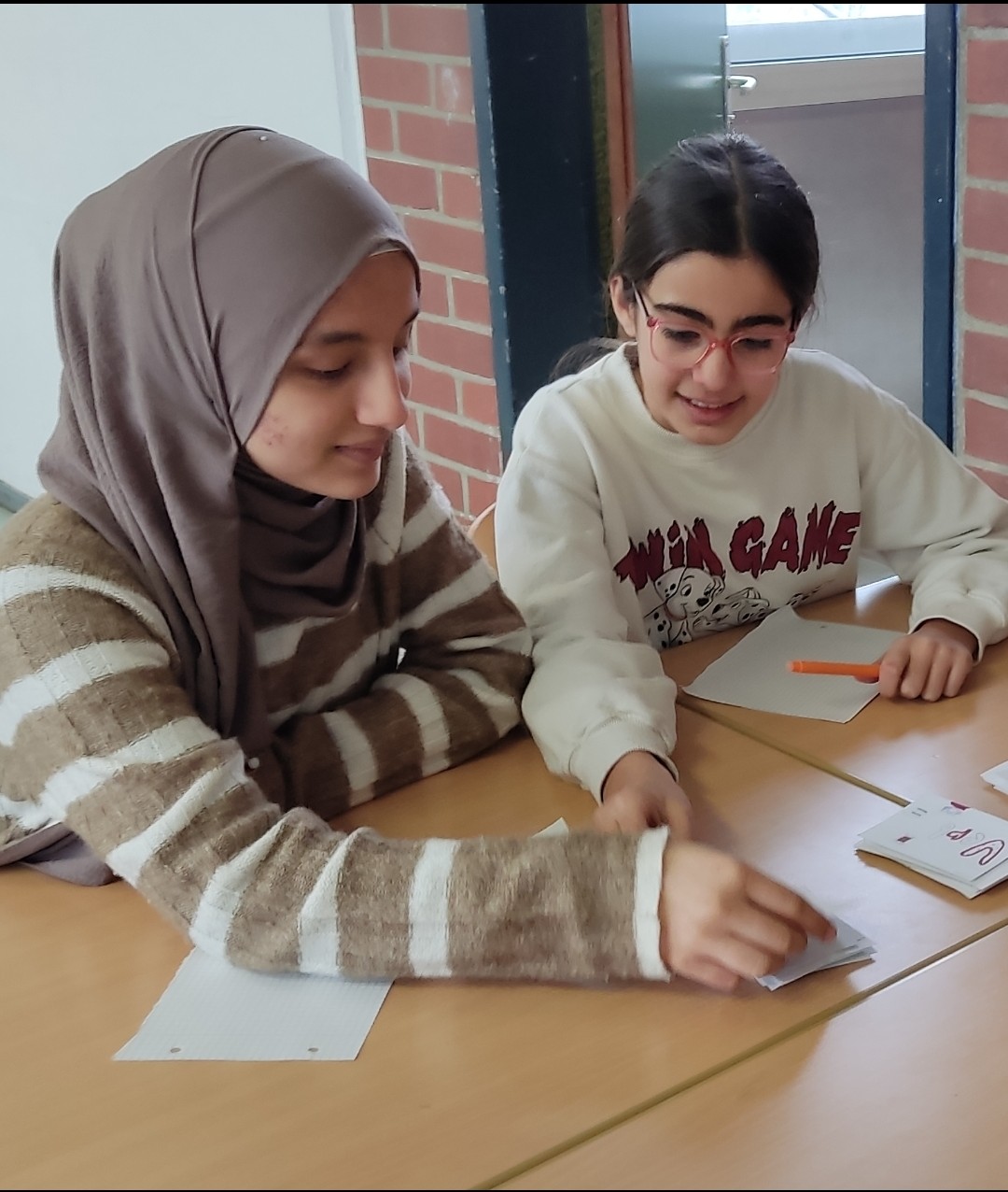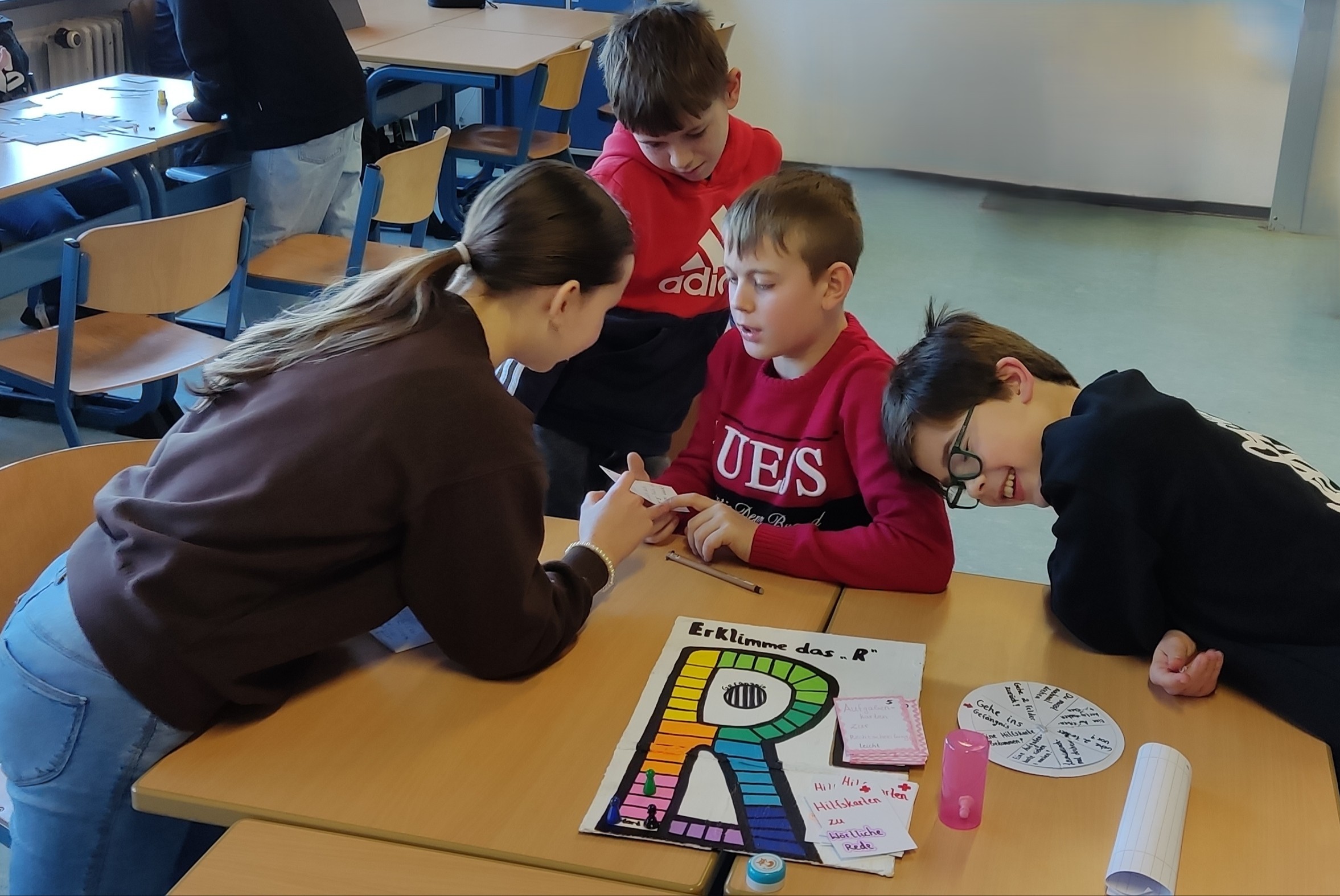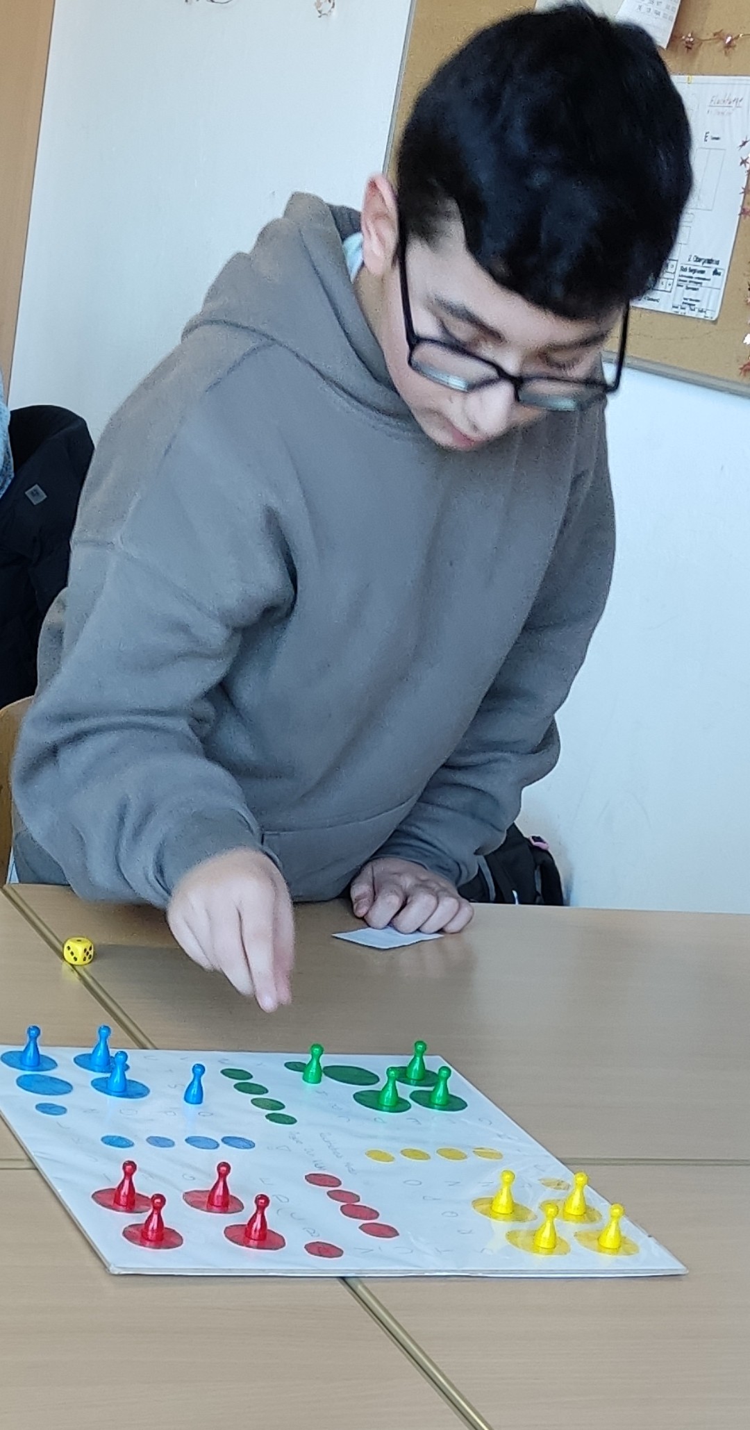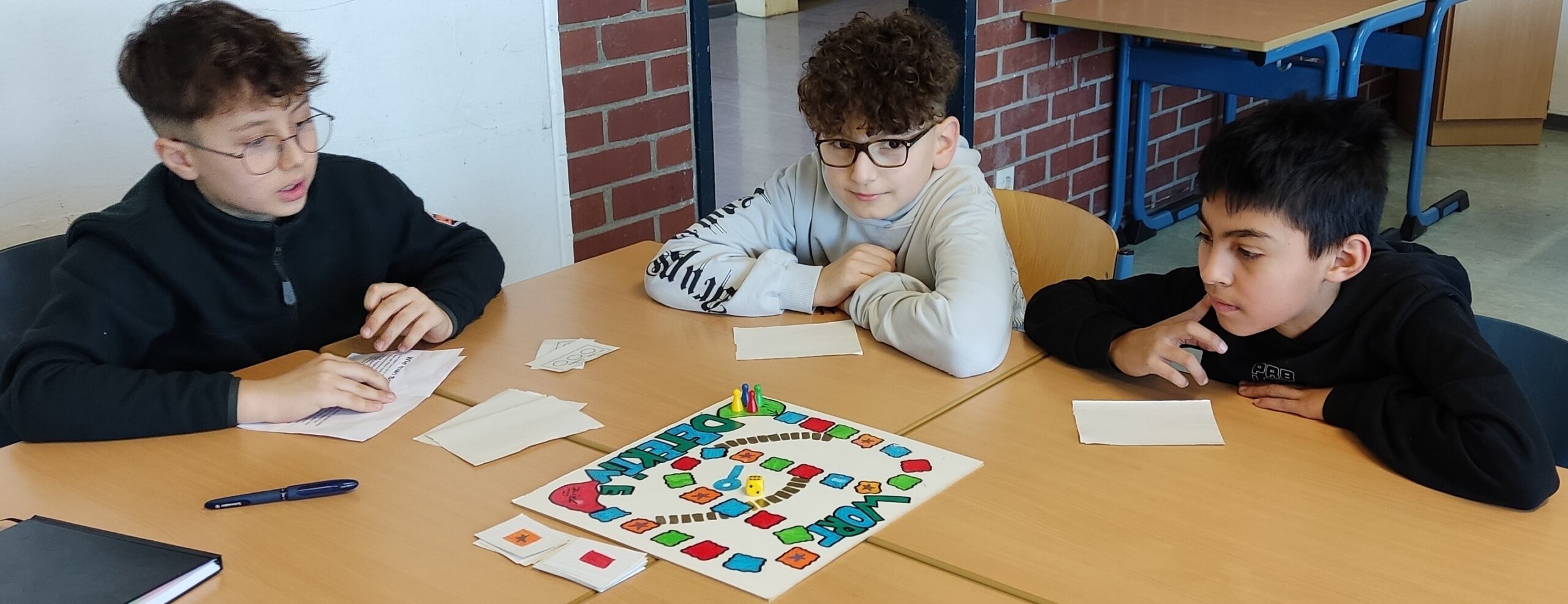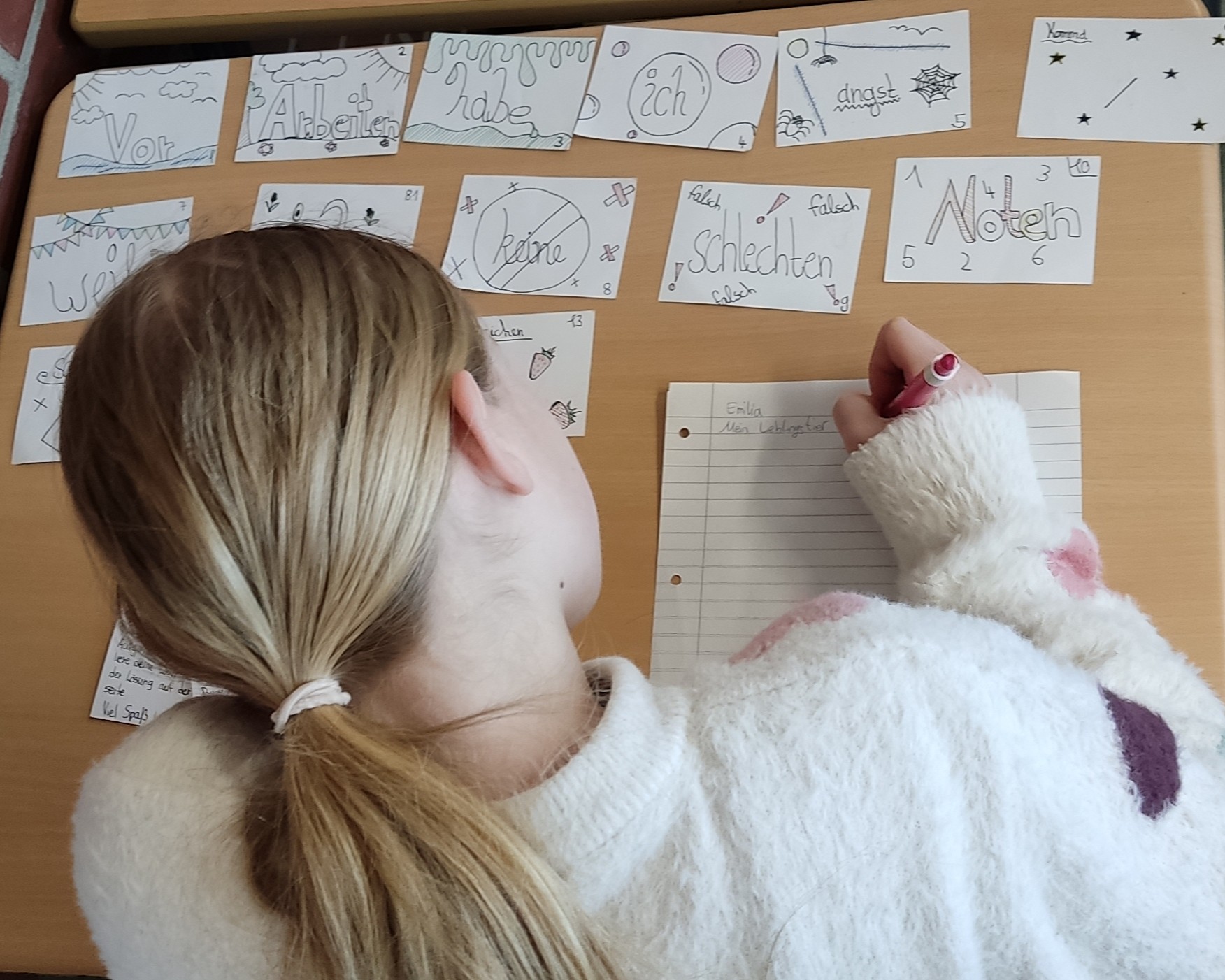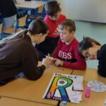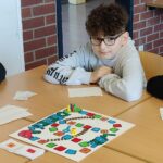 „Ein bisschen Bedenken kamen mir kurzzeitig schon – können wir mit Spielen zur Rechtschreibung und Grammatik wirklich die anderen Kinder begeistern?“, gibt die Deutschlehrerin der Klasse 6e, Monja Schottstädt, zu. Aber die Befürchtung war zu unserer Freude umsonst: „Richtig Spaß haben wir!“; „Können wir nicht noch ein bisschen bleiben?“; „Ich lös nur noch die beiden Aufgaben, bitte nur noch einen Moment!“, um nur einige Stimmen unserer Lernenden aus den fünften Klassen zu Wort kommen zu lassen. An insgesamt 14 Stationen hatten die Teams aus der Klasse 6e je ein Spiel aufgebaut: Ob ein wenig an Monopoly, Mensch-ärgere-dich-nicht, Memory, Stranger-things und vielem mehr orientiert, hier wurden unter anderem Groß- und Kleinschreibung, Kommasetzung und die Zuordnung der Wortarten in ein ganz neues Gewand gekleidet, um den Ehrgeiz zu kitzeln und statt drögem Füllen von Lückentexten einmal eine andere Art des Übens in den Mittelpunkt zu stellen. Dem waren Wochen des Übens, Planens und kreativen Gestaltens vorausgegangen. Kreativ und detailreich floss es in diverse Spielideen und -umsetzungen. Auch eine eigens erstellte Webpage zum Lernen wie auch ein Lernvideo durften nicht fehlen. Und die Mühe hat sich gelohnt: In der ersten Spielerunde in der Klasse selbst zeigte sich schon, wie liebevoll, sinnig und reflektiert die Spiele angelegt waren. Und am Mittwoch und Donnerstag in den Spielstunden mit den fünften Klassen wurde dies breit honoriert. Aber auch die Fünftklässler:innen konnten punkten und bekamen großes Lob von den Spieleentwickler:innen der 6e: „Die Kinder an meinem Tisch haben super gespielt. Ich würd‘ mich freuen, wenn wir bald wieder zusammen so eine Spielerunde machen könnten!“