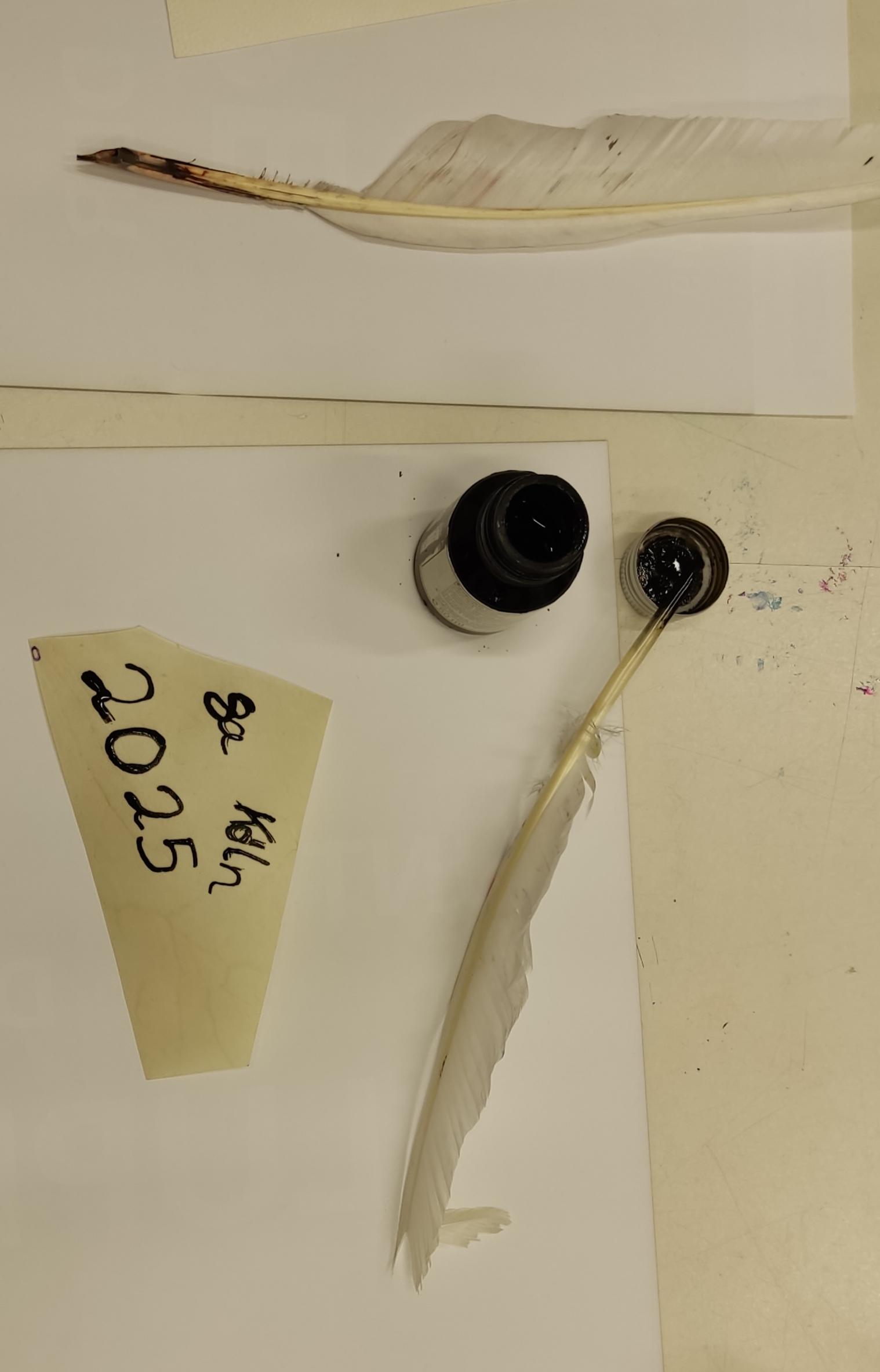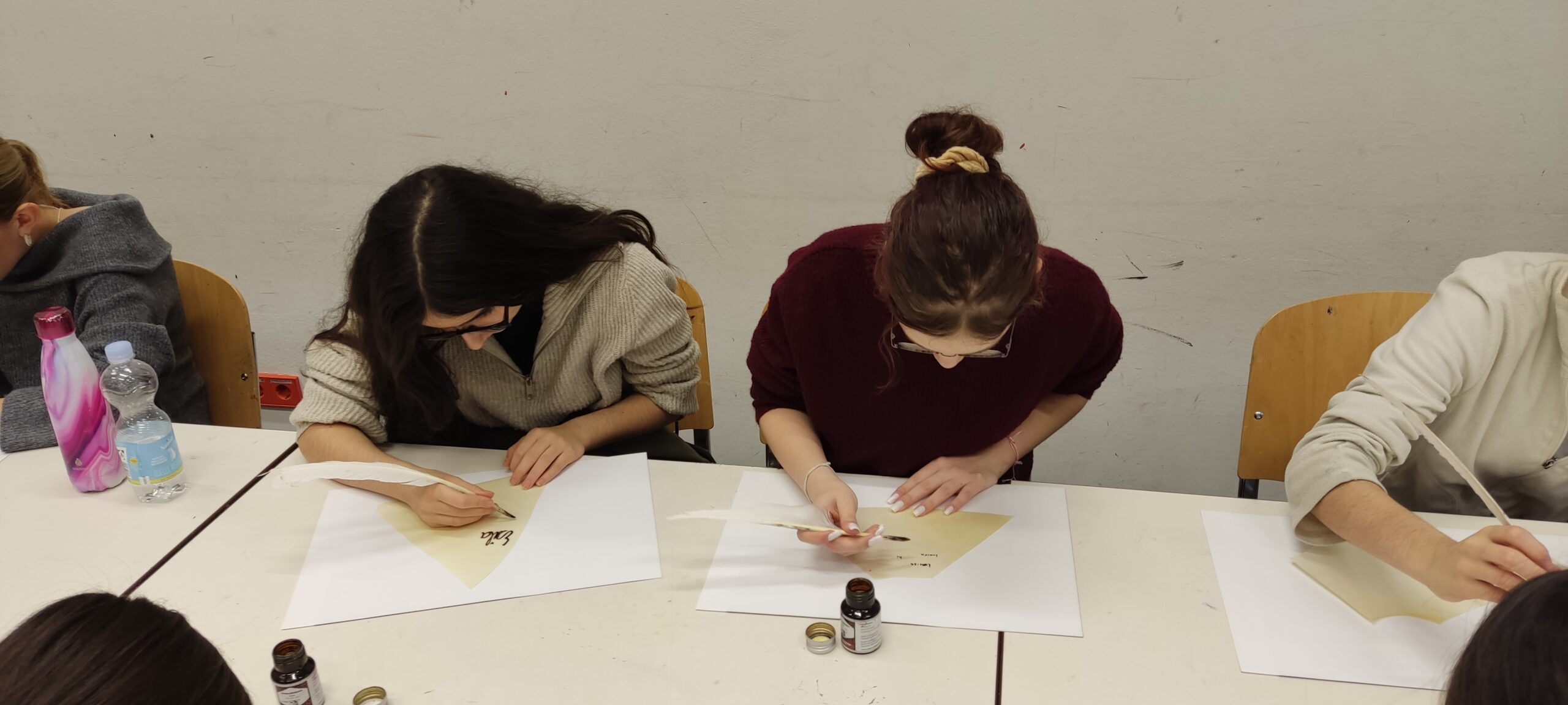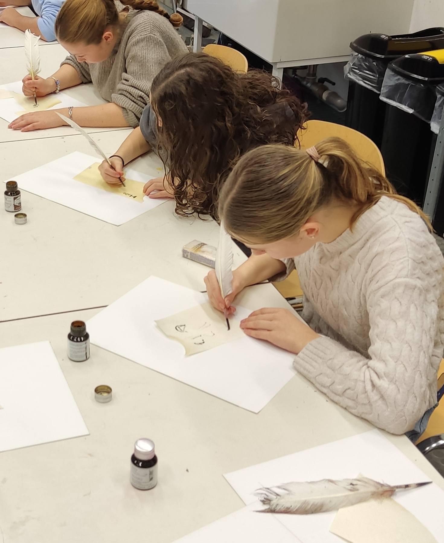 „Wie kann man denn auf diese Weise ganze Bücher kopieren?“ Die Klasse 8a erprobte am Freitag, den 28.11. im Kölner Museum Schnütgen das Schreiben von Texten auf „mittelalterliche Art und Weise“, nämlich mit Gänsefeder und Tinte – stilecht auf Pergament. Die große Herausforderung dabei ist, den Lauf der Tinte zu kontrollieren, sodass es zu gleichmäßigen Schriftlinien, anstatt zu Tintenkleksen kommt. Denn Fehler verzeiht das Pergament nicht. Nach anfänglichen Anlaufschwierigkeiten schafften wir es aber, Botschaften auf Pergament und sogar Postkartengrüße zu verfassen.