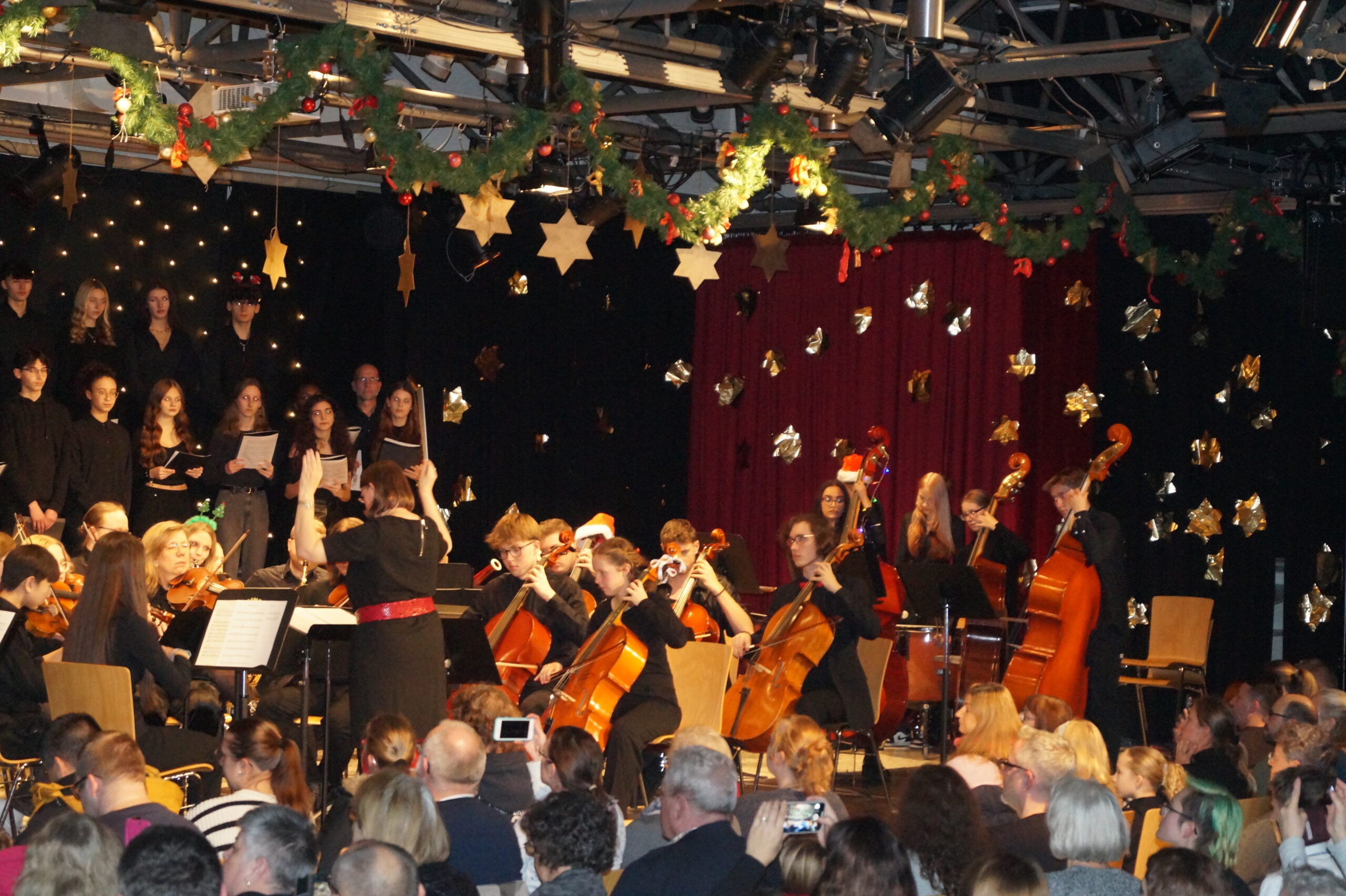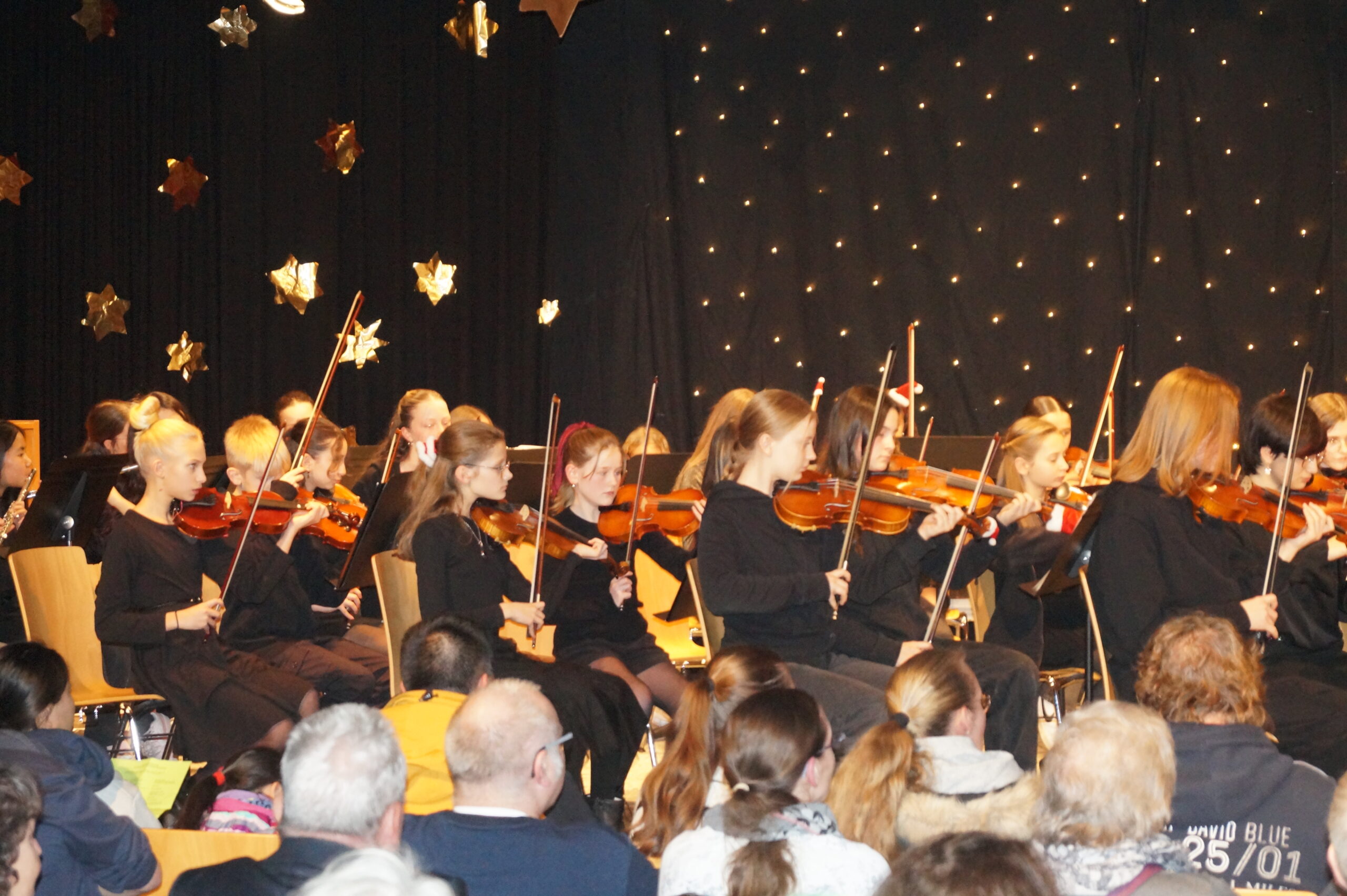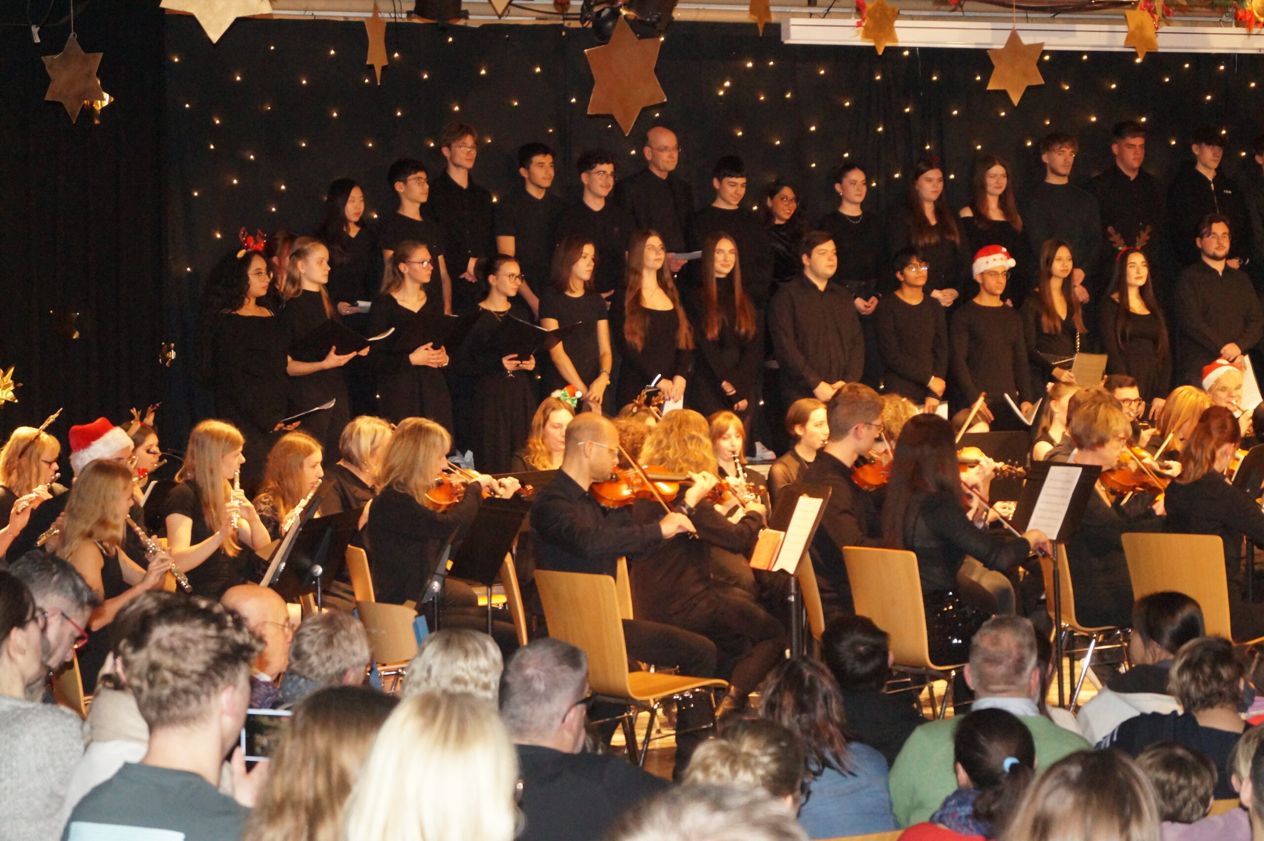 Die Konzerteröffnung übernahm das B-Orchester mit populären Stücken wie Deck the Halls, All I Want for Christmas Is You und We wish you a Merry Christmas. Mit Snowman und Last Christmas folgten gemeinsame Darbietungen des Sek I-Chores und des B-Orchesters. Die Orchesterklassen der Jahrgänge 5 und 6 präsentierten echte Weihnachtsklassiker wie Jingle Bells und We Three Kings. Ein besonderes Highlight war die Gesangsdarbietung des bekannten Santa Lucia-Liedes durch Daniil Tatevosyan aus dem 5. Jahrgang. Das Publikum war absolut begeistert von der stimmlichen Klarheit und der großartigen Gesangsleistung des jungen Schülers. Gleiches gilt für die Beiträge des Oberstufenchores, der neben dem Weihnachtsklassiker Wonderful Christmastime auch einen Kanon über das Thema aus Händels Haleluja sang. Das Ehemaligenorchester und das A-Orchester versetzten das Publikum mit Stücken wie Christmas Memories, Sleigh Ride und Zumba Zumba in perfekte Vorweihnachtstimmung. Den Abschluss bildete ganz traditionell das gemeinsame Singen des Liedes „O, du fröhliche“, wobei das gesamte Publikum einstimmte.