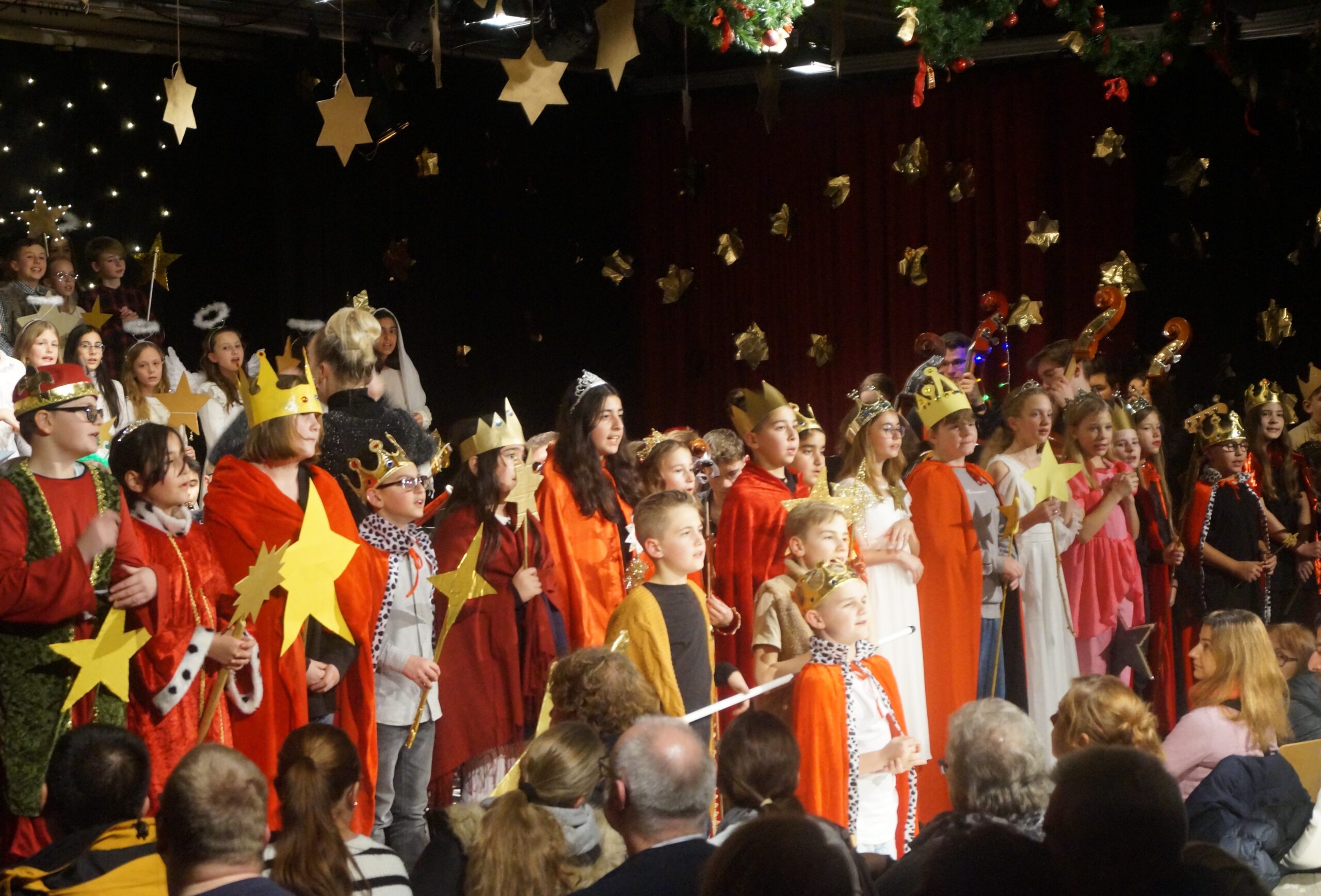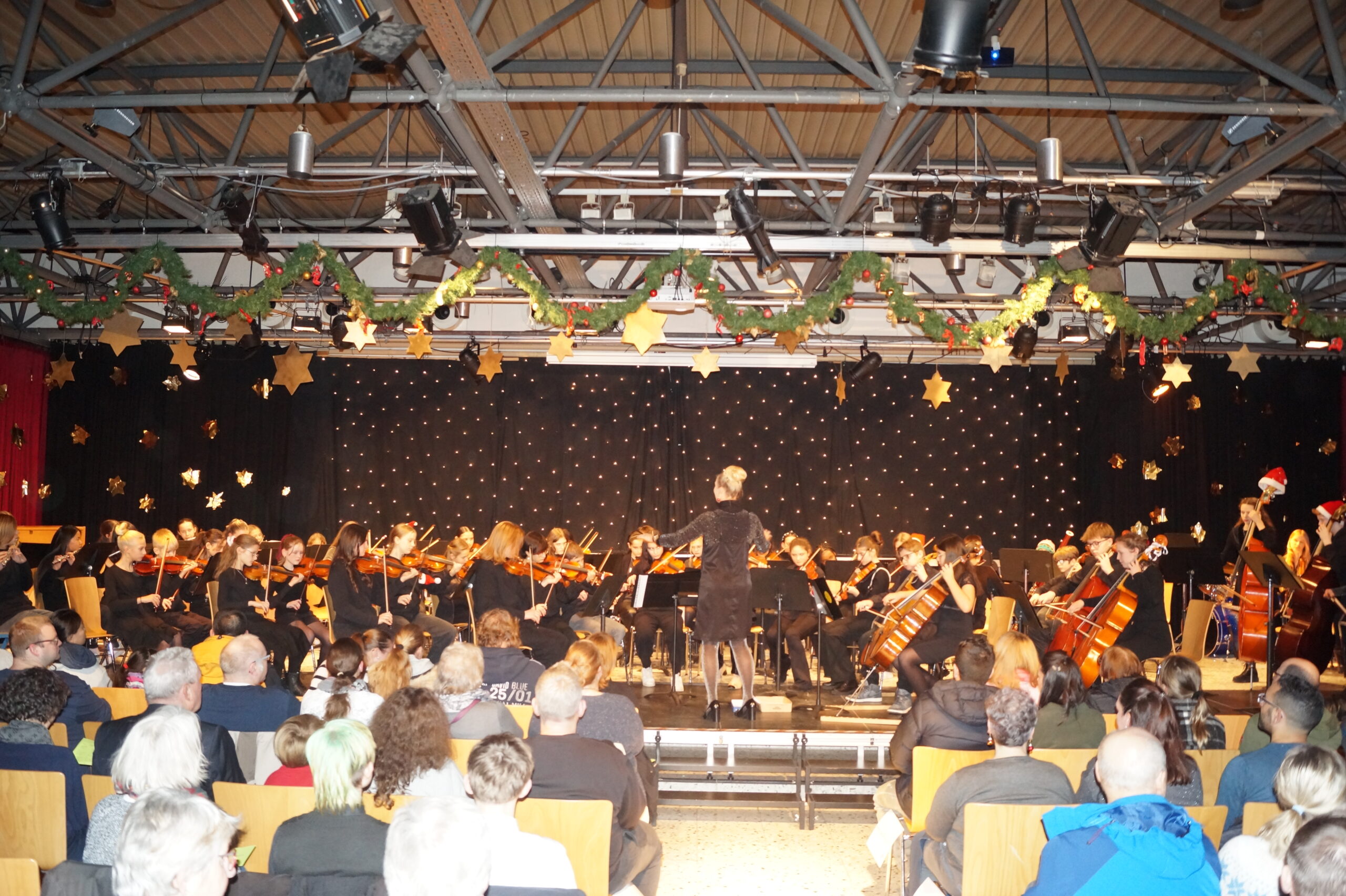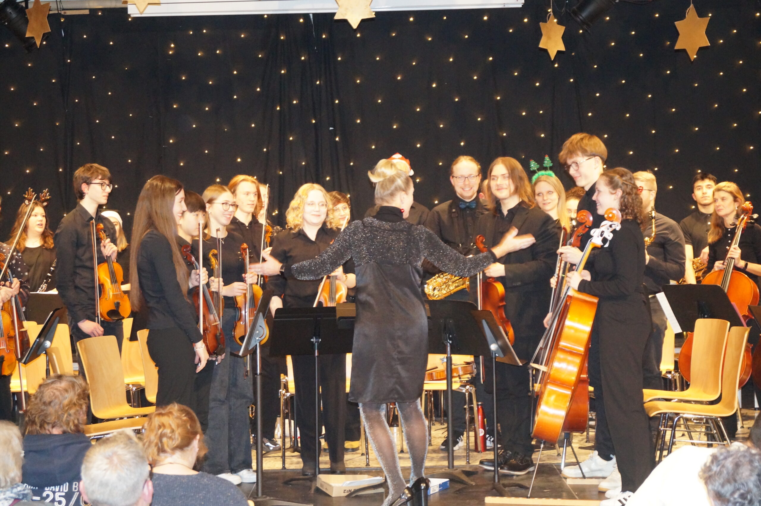 Die Konzerteröffnung übernahm das B-Orchester mit populären Stücken wie Deck the Halls, All I Want for Christmas Is You und We wish you a Merry Christmas. Mit Snowman und Last Christmas folgten gemeinsame Darbietungen des Sek I-Chores und des B-Orchesters. Die Orchesterklassen der Jahrgänge 5 und 6 präsentierten echte Weihnachtsklassiker wie Jingle Bells und We Three Kings. Ein besonderes Highlight war die Gesangsdarbietung des bekannten Santa Lucia-Liedes durch Daniil Tatevosyan aus dem 5. Jahrgang. Das Publikum war absolut begeistert von der stimmlichen Klarheit und der großartigen Gesangsleistung des jungen Schülers. Gleiches gilt für die Beiträge des Oberstufenchores, der neben dem Weihnachtsklassiker Wonderful Christmastime auch einen Kanon über das Thema aus Händels Haleluja sang. Das Ehemaligenorchester und das A-Orchester versetzten das Publikum mit Stücken wie Christmas Memories, Sleigh Ride und Zumba Zumba in perfekte Vorweihnachtstimmung. Den Abschluss bildete ganz traditionell das gemeinsame Singen des Liedes „O, du fröhliche“, wobei das gesamte Publikum einstimmte.