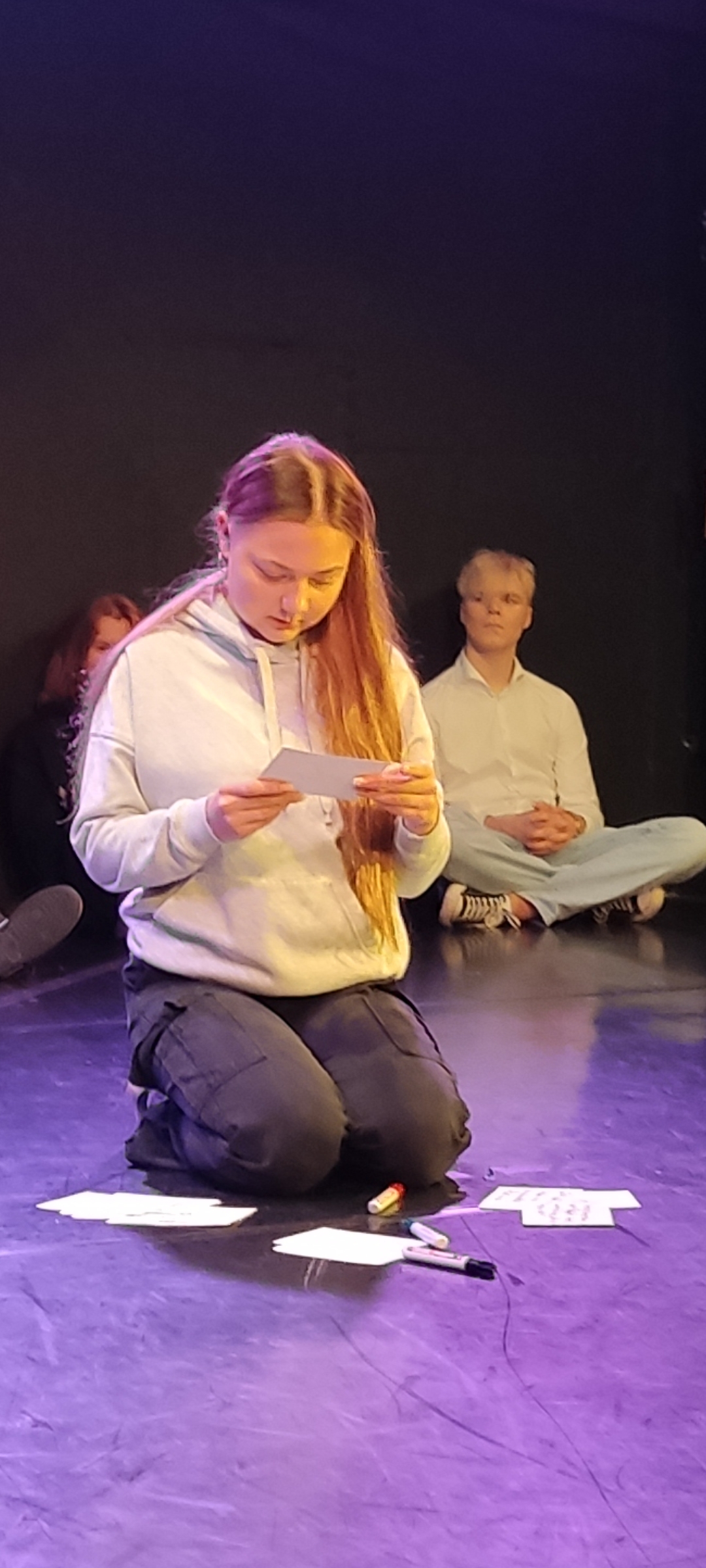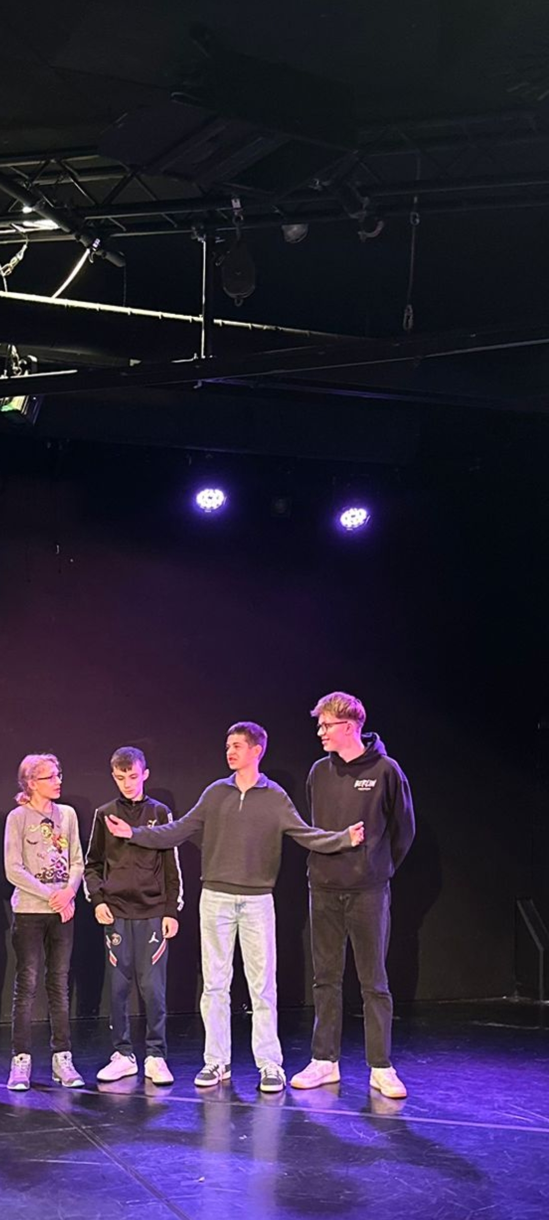 Vor der Inszenierung konnten wir mit der Theaterpädagogin Lena Hilberger arbeiten, uns auf das Stück einstimmen und auf der kleinen Theaterbühne selbst geschriebene Reden wie ein zorniger „Räuber“ vortragen. Reden schwangen dann auch die Figuren auf der Bühne. Die Düsseldorfer Inszenierung konzentriert sich nämlich ganz auf diese Räuberhandlung, blendet den Familienkonflikt und die Liebesgeschichte darüber fast ganz aus. Die Fragen eines Einzelnen, der Hauptfigur Karl von Moor, ob es noch richtig ist, was er tut, werden zu Fragen der Gruppe. Die überlegt am Ende, einen neuen Weg einzuschlagen, und es dieses Mal etwas besser zu machen.